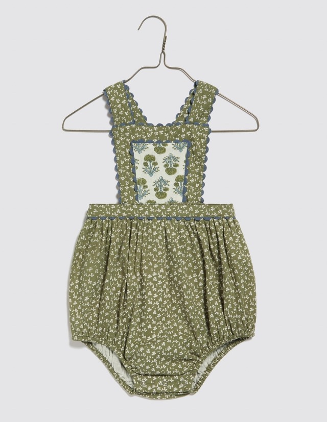 Little Cotton Clothes SS Collection オーガニックの花柄のコットンで作られた可愛らしいロンパース。クロスバックストラップ、ビブに対位の花柄のパネルがあり、ブルマスタイルのボトムがとても可愛いです。 素材 : オーガニックコットン100% サイズ 6-12m 着丈 : 42.5cm 2-3y 着丈:49cm - - about - - 5人の子供を持つ姉妹によってスタートしたイギリスブランド。 私たちの子供時代と、イギリスの田舎で育った幸せに満ち溢れた時間からインスピレーションされています。 ヴィンテージにインスパイアされた、伝統的でノスタルジックなブランド。 オーガニックコットンを使用することで長持ちし、代々受け継がれる洋服です。