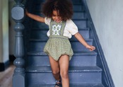 オーガニックの花柄のコットンで作られた可愛らしいロンパース。クロスバックストラップ、ビブに対位の花柄のパネルがあり、ブルマスタイルのボトムがとても可愛いです。