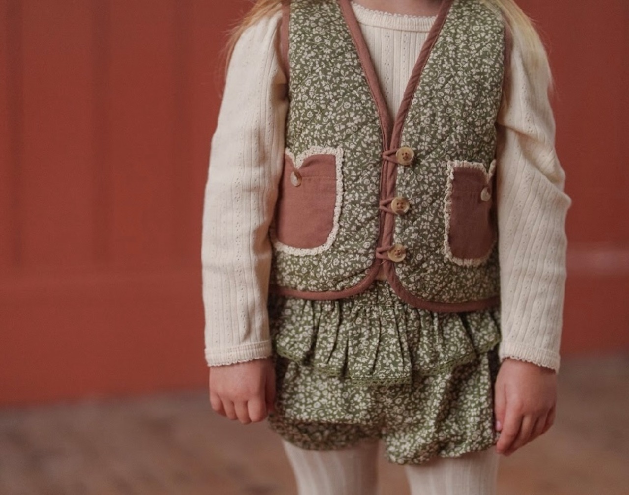 オーガニックのCombeフローラル生地で作られた素敵なブルマーロンパース。このヴィンテージ風のロンパースは、ウエストにフリルがあり、コットンタイツ、ブラウス、ポインテルのTシャツと相性が抜群です。