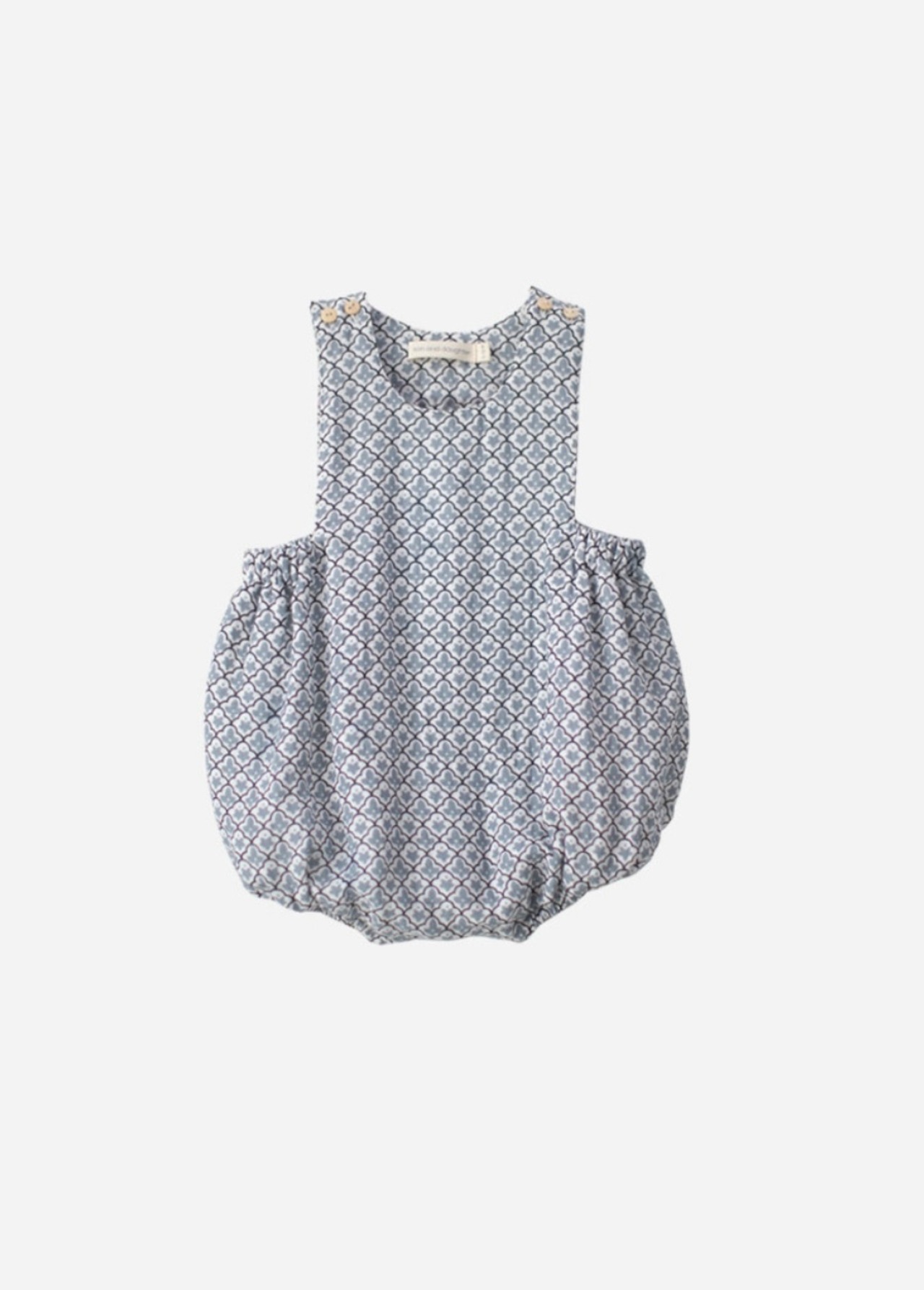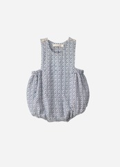 美しいブルーの花柄が愛らしいバブルロンパース。クラシカルなラウンドネック、肩ボタン、スナップボタンでお着替えも簡単です。