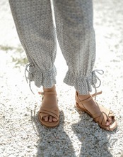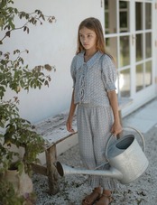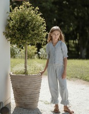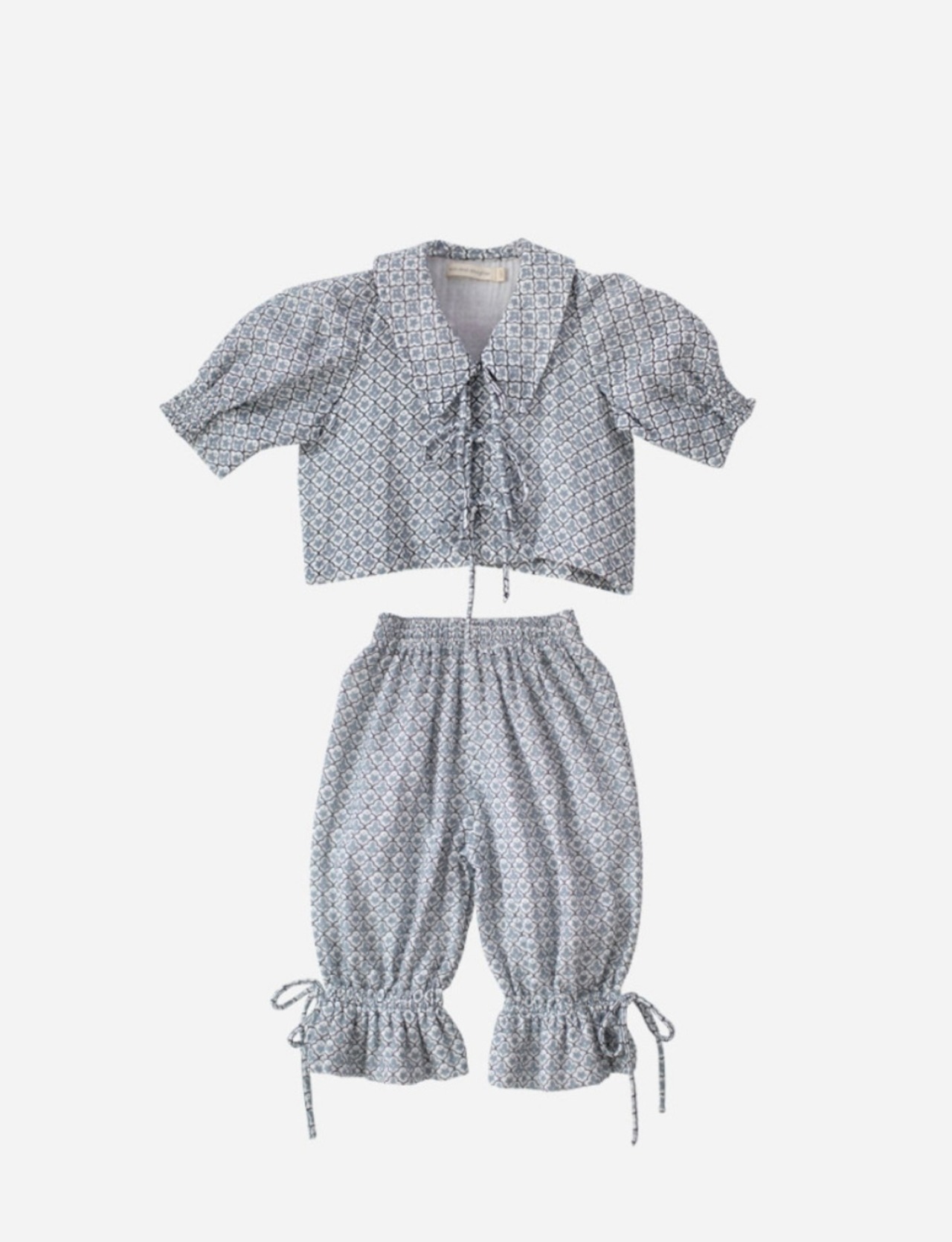美しいブルーの花柄のワイドカラートップスとアンクルタイパンツの存在感のあるセットです。トップスはパフスリーブが特徴で、フロントタイのディテールがアクセントになっています。